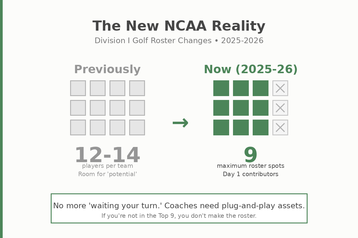 Starting this 2025-2026 season, the NCAA officially implemented a 9-player roster cap for D1 Golf. In the past, a coach could carry 12 or 14 players, leaving a few spots for "projects" or late bloomers from Thailand who showed "potential."